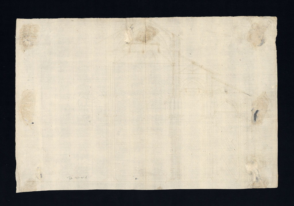 Il disegno non ha avuto un’estesa fortuna critica, ma compare nell’inventario della Raccolta Bianconi, redatto da Isabella Balestreri (Balestreri, 1993; Balestreri 1995). Esiste nel secondo tomo della Raccolta, infatti, un piccolo gruppo di 5 disegni che recano il medesimo soggetto riproposto nelle stesse dimensioni e perfino con gli stessi particolari (ASCMi, Raccolta Bianconi, II, ff. 17vA, 17vC, 18vA, 18vC, 20vA; in Cassi Ramelli, 1965, p. 61, fig. 44 è riprodotto il disegno al f. 17rC), se si eccettua la realizzazione di un’ombreggiatura a tratteggio e la presenza di alcune iscrizioni in uno dei pezzi. Anche le caratteristiche tecniche e la carta sul quale sono realizzati sembra essere la medesima, elemento importante ai fini della datazione dei pezzi, poiché tutti recano un tipo di filigrana documentata tra l’ultimo quarto del XVI e il primo quarto del XVII secolo (si noti in particolare che i ff. 17vA, 17vC e 20vA hanno la medesima filigrana, così come i ff. 18vA e 18vC, con filigrana della stessa tipologia dei precedenti, ma con leggere varianti). Il gruppo di disegni mostra un sistema di strutture lignee tra cui si notano le capriate delle navate minori nord, poste al di sopra delle volte a reggere le falde del tetto (che Cassi Ramelli indica come provvisorie, utilizzate in fase di costruzione; Cassi Ramelli, 1965, p. 61, didascalia della fig. 44) e, inoltre, le chiavi presumibilmente metalliche inserite al di sopra dei capitelli (come si evince dalle iscrizioni con la parola «chiave», presenti nel foglio 18rC). In questo disegno sono indicate con tratteggio obliquo le murature in sezione. In corrispondenza della navata mediana e, nel caso di quella centrale, sono disegnati i ponteggi forse utili per la realizzazione delle volte stesse, che presentano anche evidenziate al tratto le parti metalliche.