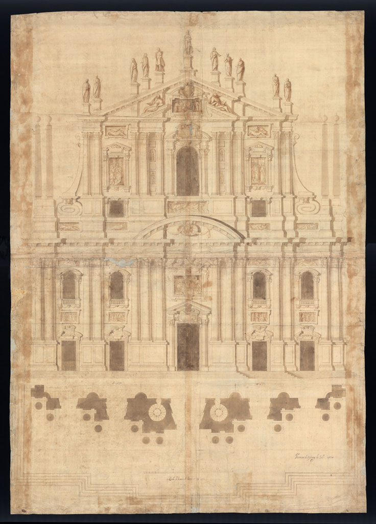 Nell’ambito della progettazione della facciata, l’idea di Girolamo de Capitani da Sesto si colloca in un momento particolarmente ricco di proposte, che ha interessato tutto il primo decennio del Seicento. La proposta di Girolamo de Capitani, con colonne su piedistalli, è stata letta dalla storiografia (Repishti, 2003, p. 64, 68; Bortolozzi, 2014, pp. 46-47) in dipendenza da alcune delle idee di Francesco Maria Richino, come il foglio 29r del secondo tomo della Raccolta Bianconi. Similmente a Richino, infatti, Girolamo de Capitani propone un aggetto progressivo dei piani di facciata verso il centro, arricchito dal ritmo serrato delle colonne libere poste a evidenziare i trapassi di piano, aggiungendo però piedistalli sotto le colonne e risolvendo gli spigoli esterni mediante la ripetizione del medesimo sistema di colonne libere anziché paraste binate. Questo progetto è anche uno di pochi che, similmente alla proposta di Richino, accoglie percorsi scalari nello spessore murario accanto al portale maggiore.