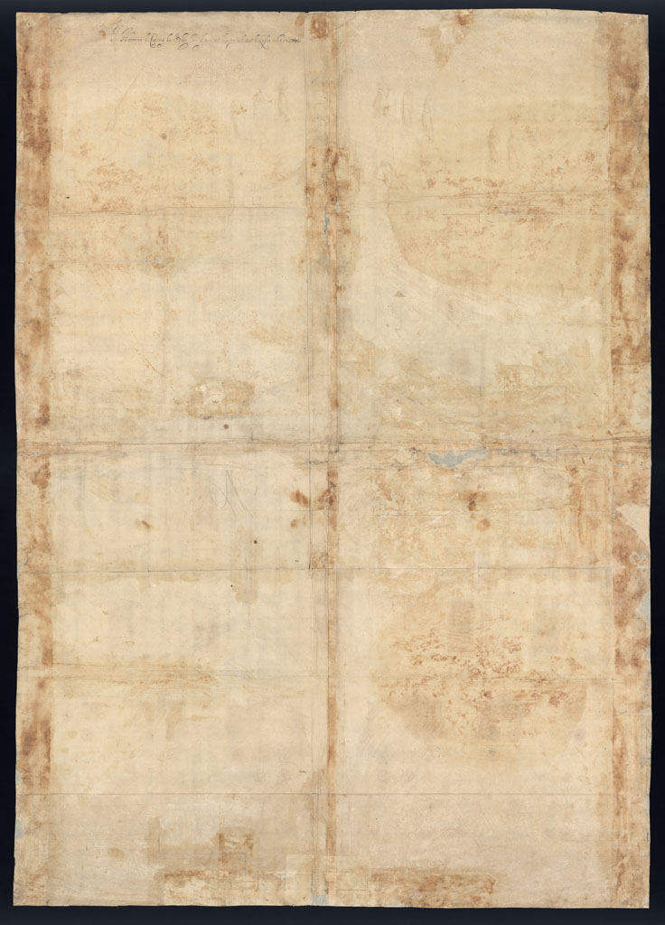 Il disegno è composto su quattro fogli consunti e che mostrano macchie. Ai margini sono presenti tracce di una cornice, in corrispondenza delle quali la carta è molto imbrunita. Sul verso si notano tracce di colla che hanno creato macchie brune. In corrispondenza delle piegature piccole abrasioni, consunzione di alcune parti di inchiostro e piccoli strappi e lacune compensate con strisce di carta di supporto sul verso.